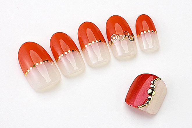 ハンドよりも濃いオレンジをチョイスして、パールホワイトと組み合わせます。流れるようなラインは大きめのスタッズで華やかに。