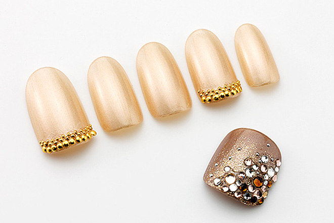 仕事柄長く爪を伸ばせない人でも、ゴールドなら単色塗りでゴージャスな雰囲気を演出してくれます。親指と薬指の根元には大小のゴールドのブリオンをネックレスのように飾って。華奢なブリオンで、洗練された大人の魅力を引き出しましょう。