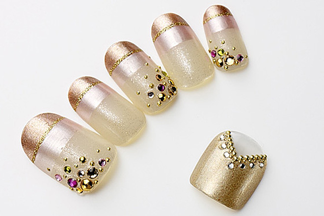 薄いパールベージュのベースに、ピンクとゴールドでボーダーをアレンジします。ゴールドは肌なじみも良くどんな色とも相性がいいカラー。ランダムに配置したパープルやゴールドのカラフルなストーンにもしっくりとなじみます。