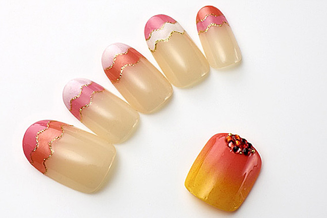 オレンジからイエローのグラデーション&カラーストーンで華やかに。大胆な色使いはフットならでのデザインです。