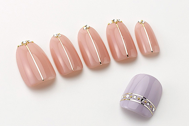 ハンドと同じパステルトーンのパープルのベースに、シルバーのテープで横ラインを作ります。ラインの間にはストーンを並べて、シックな雰囲気に。
