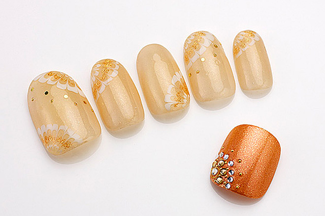 人気の高いピーコックデザイン。淡いゴールドやホワイトで描けば、さりげない指先のオシャレの完成です。フットはストーンでピーコック柄をデザインして、よりゴージャスに仕上げます。