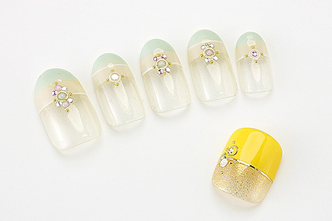 グリーンと相性のいいイエローをチョイス。イエローにラメゴールドを組み合わせて、大人っぽさの中にもキュート&アクティブさをプラスしています。