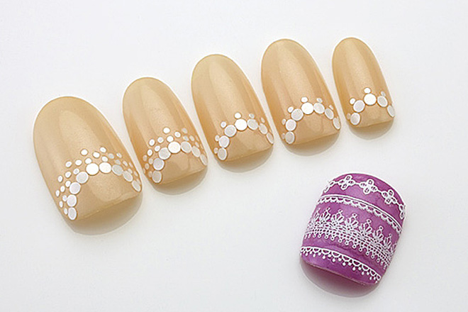 パステルトーンの淡いパープルのベースに、フットはシールのレースデザインをオン。足元はしっかり主張するのがポイントです。