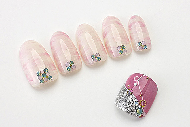 ハンドよりも濃いピンクをベースに、シルバーラメを組み合わせ華やかな雰囲気に。同じストーンを使用することで、統一感を持たせています。