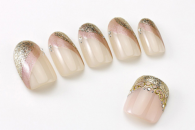先端にはパールの入った淡いピンクと、ゴールドのグリッターラメで斜めダブルフレンチを描きます。ダブルフレンチで指先に視線を集中させ、根元まで引いたピンクのラインで爪を縦長に見せる効果も。サイドに小粒のストーンできらめきをプラスします。