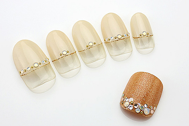 先端はパールベージュ、根元は少し空けてセパレートデザインに。シックな雰囲気にまとめるため、目立たない小ぶりのホワイトのストーン&ゴールドのブリオンを使います。さりげないアクセントにゴールドを効かせるのがポイントです。