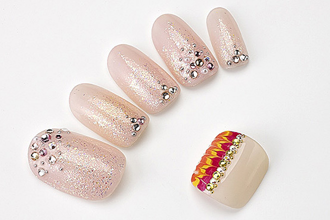 オレンジ・イエロー・レッドで片サイドをマーブルアレンジに。センターにゴールド系のストーンを置いてより華やかさをプラスします。