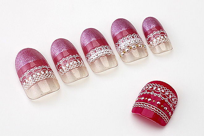 クリアピンクのベースにチェリーピンク×パープルラメでダブルセパレートを作ります。青みがかったチェリーピンクなら甘くなり過ぎません。ブルセパレートの下に幅が広めのレースをあしらい、薬指にはパールとゴールドのブリオンをリングのように並べます。