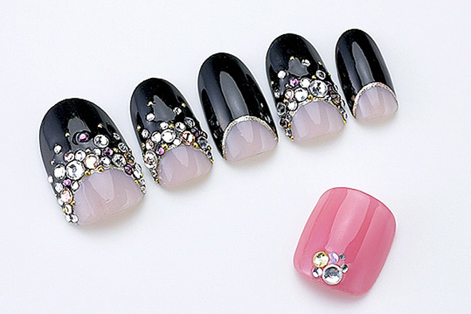 夜遊びの定番色ブラックに淡いカラーストーンを組み合わせて、ちょっぴり控え目な甘さをプラスしました。指先にキラキラ輝くストーンがあれば、アクセサリー要らず!