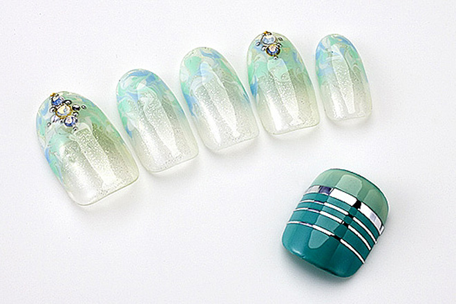 人気の高いエスニックモチーフに、カラーストーン、スタッズ、リングを使い大きめのデザインをあしらいます。ハンドはクリアラメベースにブルーグリーンを基調としたマーブルに仕上げます。ホワイトを効かせることで上品さをプラスしています。