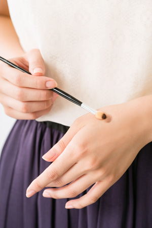 よく「指でつけるのはダメですよね?」と聞かれますが、アイシャドウをのせるのに、指・ブラシ・チップのどれを使ってもOKです。ただ、色を取ったら必ず手の甲でまんべんなくつくように調整すること! それから目にのせるようにしましょう。取ってすぐ目にのせる行為がムラの原因です。