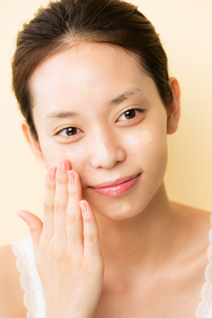 蛍光灯や白熱灯だと、どうしても色味が正確に判断できなかったり、厚塗りになってしまいがちです。自然光の入る場所でメイクをするか、難しい場合は最後のチェックだけでも自然光のもとで行いましょう。また、薄付きを目指すならリキッドファンデが◎。小さめのパール粒大の4分の1をそれぞれ「右頬」「左頬」「額」に、残り4分の1で「目周り」「鼻」「口周り」に。内側から外側へ向かってフェイドアウトさせるように薄く丁寧に伸ばします。