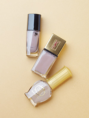 【上】微細パール入りで手肌を明るく見せるスモーキーグレー。ヴェルニ イン ラヴ 537 2100円/ランコム【中央】肌になじむライトグレー。速乾性が高く塗りやすいのも魅力。ラ ラッククチュール No.39 3150円/イヴ・サンローラン・ボーテ ★モデル使用アイテム【下】マットなグレーとベージュの中間色。高いツヤで指先を美しく見せる。スウィーツ スウィーツ ネイルパティシエ 32(11月23日発売) 378円/シャンティ