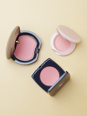 【上右】角度によって光感が変化するシャンパンゴールドパール入りで自然な立体感を演出。クリーミィ チーク パウダー 02 2940円/ポール & ジョー ボーテ 【上左】ライトタッチオイルを配合し、するすると肌にフィット。グローイング クリーム ブラッシャー 01 4725円/ソニア リキエル ★モデル使用アイテム【下】シルクのようになめらかな質感で、光沢のある仕上がりに。ル ブラッシュ クレーム ドゥ シャネル 63 4725円/シャネル