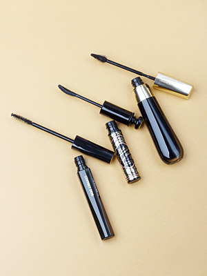 【上】目尻にもフィットする特殊ブラシで180°広がった扇まつ毛を叶える。シュールレアリスト エバーフレッシュ スマッジプルーフ 01 5880円/ヘレナ ルビンスタイン【中央】漆黒ファイバーと液のびベースで上向きロングまつ毛に。マジョリカ マジョルカ ラッシュエキスパンダー エッジマイスター BK999 1260円/資生堂 ★モデル使用アイテム【下】カールを長時間キープして、艶やかに整える。コフレドール グラマラスビューティマスカラ BK-40 2625円(編集部調べ)/カネボウ化粧品