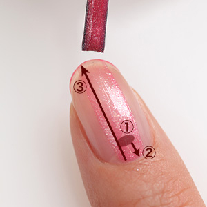 ネイルカラーをブラシに適量取り、根元より少し手前に筆を置きます(1)。そこから少しだけ筆先を甘皮側に押し上げ、甘皮ラインぎりぎりまでカラーを塗りましょう(2)。次に筆先を滑らせるようにして、真っ直ぐ先端に向かって一気に塗ります(3)。根元ギリギリの部分は筆をつけず、表面張力を利用して仕上げるとハミ出し防止に。