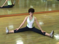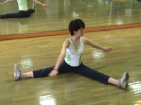 - 両脚を大きく開いて座ります。しっかりお腹を引き上げて背筋を伸ばし、骨盤を床に立たせるようにします。