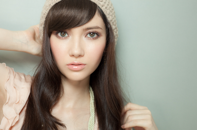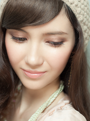 女性らしさを醸し出す流しバングの印象を高めるのは、こっくり秋色でつくる目元にフィーチャーしたメイク。思ったよりもずっと簡単なのにそうは見えないテクニックは、いろんなメイクに応用もできるはず。