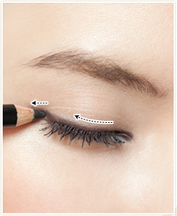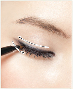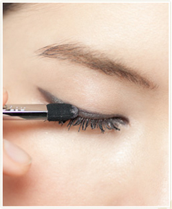 - 深い黒のペンシルライナーを使用し、上まぶたにラインを引く。目頭から目尻へフレーム通りに引いた後、目を開けて、目尻の延長線上に長めに引き、下まぶたのラインと平行になるように形づくる。