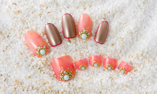「モロッコ風ファッションを意識して、タイダイ柄とストーンをデザインしました。そしてモロッコ風の色使いと相性が良いのがアースカラー。華やかなタイダイ柄とシックなアースカラーの組み合わせは、互いが引き立て合い存在感のある指先を作ります。モロッコ風、アースカラー、3本分のデザインチェンジ。夏らしさを凝縮したデザインなので“今”の気分を楽しめますよ。手足ともに入っている「ミントアラバスタ」というストーンもすごく人気。上品な印象になるのでぜひ取り入れてみてください」