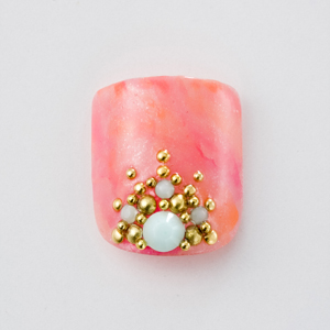 ネイルの塗り方 アースカラー:ベースにb.を塗り、蛍光ピンクと蛍光オレンジのアクリル絵の具で周りを囲む。 タイダイ柄:親指と薬指はベースとして爪全体にa.を塗る。アースカラーで使った絵の具を水で薄めて上に重ね、筆を左右に動かしてタイダイ柄に。乾いたら、爪の中央下に大きなミントアラバスタのストーンを置いてブリオンで囲む。 使用アイテム a.b.シャイニー ネイルカラー 03、12 各¥2415/ソニア リキエル ※ストーン、ブリオン/ネイリスト私物 ペディキュアの塗り方 ネイルと同様。蛍光ピンクと蛍光オレンジの色味を、ネイルよりも濃くするのがポイント。足元にはインパクトが必須。 使用アイテム シャイニー ネイルカラー 03 ¥2415/ソニア リキエル ※ストーン、ブリオン/ネイリスト私物 File.2 高野尚子さん流「フェミニンネイル」 2010年7月6日時点の情報です 前のページへ1…101112…17次のページへ