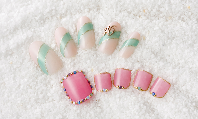 「フェミニンなイメージを作るなら、やはりピンクを選ぶのが正解。青みのあるピンクを選ぶと上品なイメージになります。今回は、ピンクにエメラルドグリーンを合わせ、ハワイアンジュエリーをあしらい、爽やかな潮風を感じるようなデザインに仕上げました。曲線的なラインが、女性らしさを表現。手元は上品に整え、足元には少し遊びを。ペディキュアはベリー系のジューシーなピンクをベースに、あえてくすんだ色のストーンを置いて質感の違いを楽しみます。色とりどりのストーンがエスニックな雰囲気を演出」