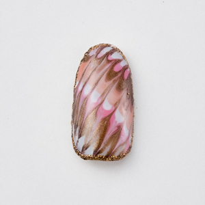 すべての爪のベースにa.を2度塗り。ピーコックにはb.c.d.e.fを使用。それぞれの色を順に使い、爪の上で斜めに縞模様を描く。そのラインに対して垂直に筆でなぞってピーコック模様を作る。(ピーコック模様の作り方はこちらを参考に>>)先端や根元は筆でシュッとラインを引いて切れ長に。最後にすべてのネイルの周りをd.のラインで囲む。親指と中指は、放射状にストーンとブリオンを並べて完成。