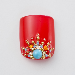 全体に2度塗りした上に、ターコイズ、ブリオンをのせる。赤をうまく塗るには、筆をネイルボトルの口でよくしごいて平らにし、筆を寝かせてできるだけ爪に水平に滑らせるのがコツ。大きいターコイズを中央下に置き、そこを基準に放射状にストーンとブリオンを並べる。