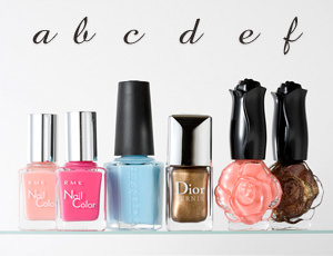 a.b. RMK ネイルカラー EX P-05、P-15 ¥1575/RMK Division c.シャレドワ ネイルカラー 61 ¥1890/TAT d. ディオール ヴェルニ 708 ¥3150/パルファン・クリスチャン・ディオール e.f アナ スイ ネイルカラー N 501、N 600 各¥1680/アナ スイ コスメティックス ※ストーン、ブリオン/ネイリスト私物
