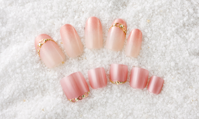 「手足をピンクで統一。手はシアーなピンクのグラデーション、足はパール感のあるローズピンクで落ち着いた印象にしました。ピンクと相性のいいゴールドのスタッズやフラットリングを手足ともに使って、デザインでもリンクさせています。ティアラやネックレスをあしらったように並べてください」