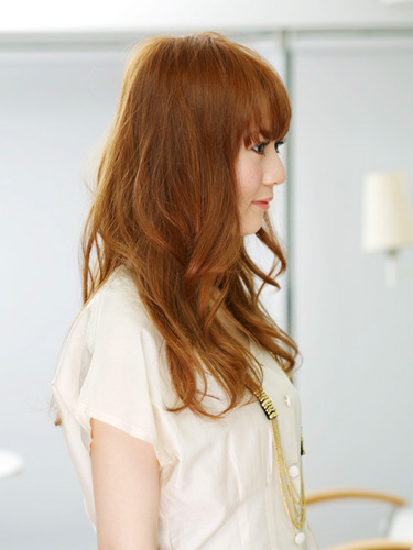 全体の髪色は明るめのベージュ。カラーリング剤を塗る時、ハイライトを太めに入れてから、健康的な肌色に見える9トーンのオレンジベージュをのせると、明るめの色でもクマが目立たない仕上がりになります。ハイライトを先に入れると髪に透明感が生まれ、肌のくすみを飛ばす効果も。