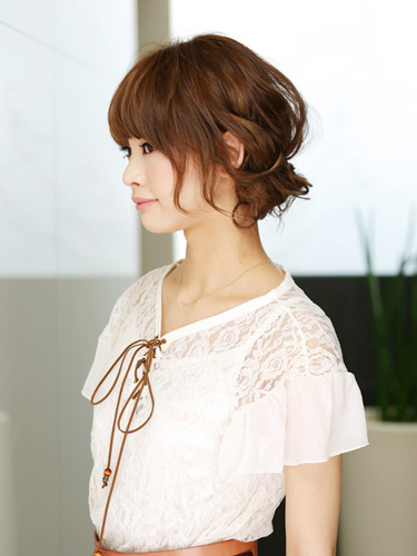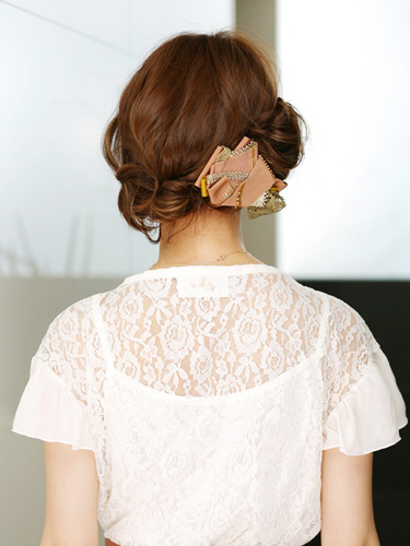 きっちりと留めずにつくった、全体にルーズな質感が魅力のアレンジ。左右で異なるまとめ方をしているので見る角度によって印象が変わります。後ろに忍ばせたヘアアクセもポイント。全体的に丸みのあるシルエットに仕上げるのがおすすめです。