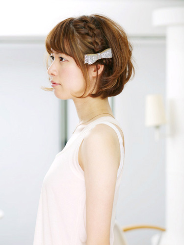 片サイドに編み込みをつくり、耳下後ろまでできたら、耳の裏側でピンで留めます。編み込みをしていない側は、ライトワックスをもみ込んでふんわり感をアップさせて。仕上げに前髪も軽くワックスをつけて流しましょう。
