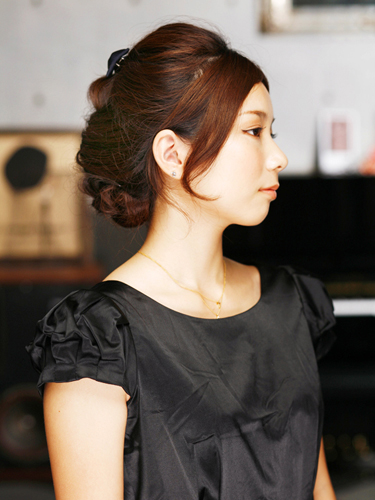 しっとりと落ち着いた雰囲気に仕上げたい時におすすめの、低め位置でのアレンジ。顔回りに少し髪の毛を残しフェイスラインに沿わせることで、儚げな女性らしさと艶っぽさを演出します。ドレスにはもちろん、着物にも似合うアレンジ。