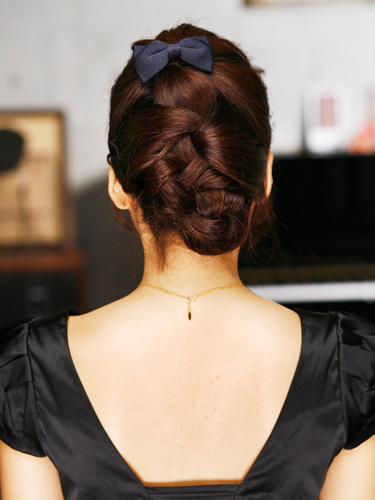 ハーフアップのラインで分けてゴムで結び、結んだゴムを隠すようにヘアアクセをつけます。ハーフアップで取った髪と下ろした髪を合わせながら、毛先まで編み込みをして行きます。編み込みが終わったら、髪の内側にしまい込んでピンで留めましょう。