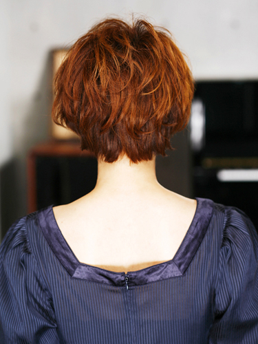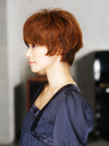 トップから入れたレイヤーと顔回りのグラデーションカットで動きをつけたショートスタイル。計算されたカールのつながりでボリュームを出して重めのシルエットに仕上げています。ボーイッシュに傾きがちなショートも長めに前髪を残して、髪全体の重さをなるべく裾の方に持ってくるとフェミニンな印象に。