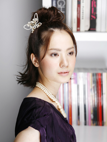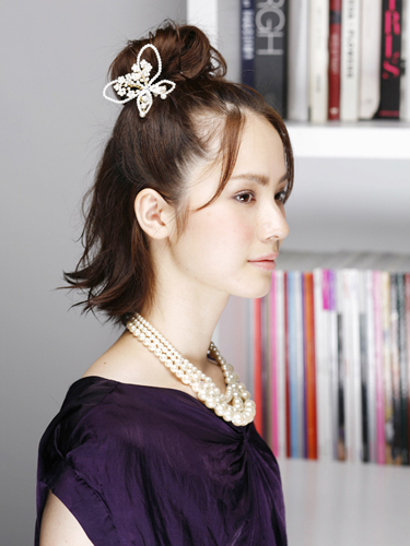 ハチ上の髪をまとめてハーフアップのおだんごに。次に、毛先に動きをつける程度に軽くアイロンで巻きます。毛先に動きがないと寂しい印象になってしまうので注意。仕上げに、おだんごのサイドに飾りピンを差します。少し大きめなものを選び、前からも見える位置に差して。