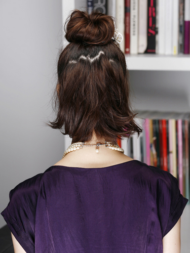 ボブスタイルだとオールアップのおだんごには髪の長さが足りないので、ハーフアップでおだんごに。おだんごが小さくならないように逆毛を立ててふんわりとボリュームを出すと、パーティらしく華やかになります。