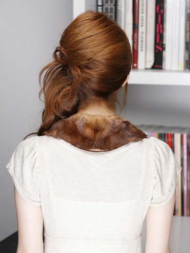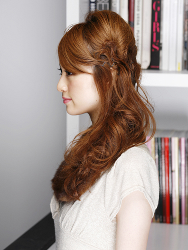 耳上と下で髪をブロッキングし、2つに分けた髪をそれぞれ左耳の後ろでピンで固定します。つまめるくらいの毛束を取って、毛先の手前までツイスト。ツイストした毛束をくるっと丸めて毛先を留めます。このときピンを隠すように留めるのがポイント。リボンや花の形をイメージすると可愛らしい仕上がりに。