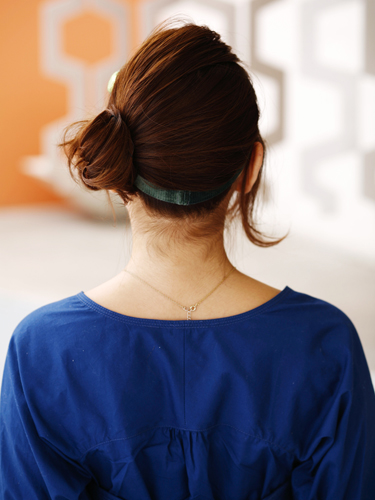 髪全体を毛先1/3程度をアイロンで巻きます。全体的に毛先のニュアンスとやわらかな動きが出ればOK。片サイドに髪をまとめてゴムで結びます。耳後ろあたりの位置で結ぶのがベスト。結んだら軽く逆毛を立ててふんわりさせておき、前方にねじりながらおだんごを作ります。ボリュームを調整しながらピンで固定して完成。