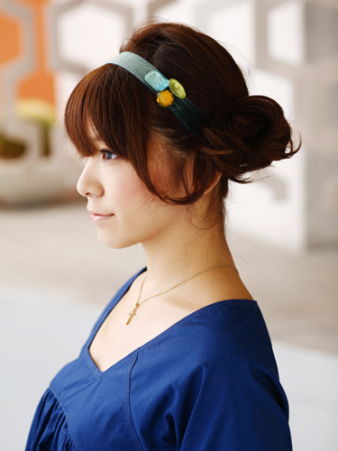 サイドのおだんごと逆サイドに残した髪のバランスが絶妙! さらに、トップとサイドのふんわり感と前髪のきっちり感をヘアアクセでしっかりコントロールした優秀スタイル。