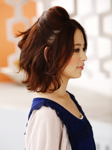 フェイスラインの前髪を少し残して、その後ろにポンパドールを作ります。髪をねじってから前方に押し出すときれいに仕上がります。ポンパドール下の右サイドの髪を、ポンパドールをピンで固定した部分に被せてさらにピンで固定。同様に、逆サイドの髪もポンパドールに被せてピンで固定。どちらのサイドから行ってもOKです。