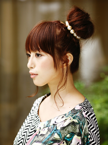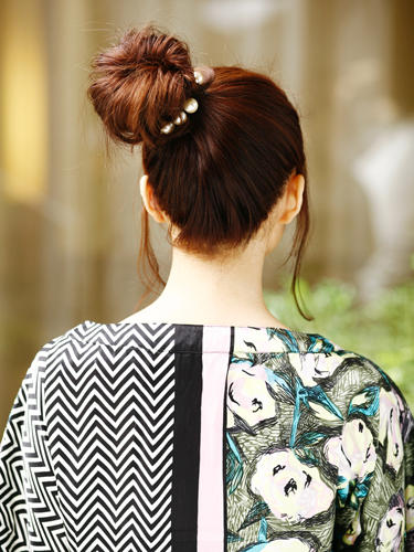 サイドにしっかりとおだんごを作ることで存在感を強調。カジュアルさを残したシンプルなスタイルだけにパールのゴムで、フォーマル感と華やかさをプラスして。