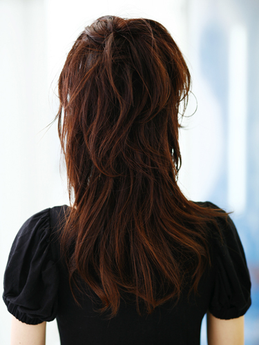 逆毛と毛先の遊びで作るふんわり部分と、タイトに締める部分とのコントラストがカギ。スタイルにメリハリが生まれ、まとまり感のある上品なハーフアップに。