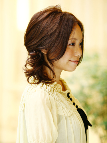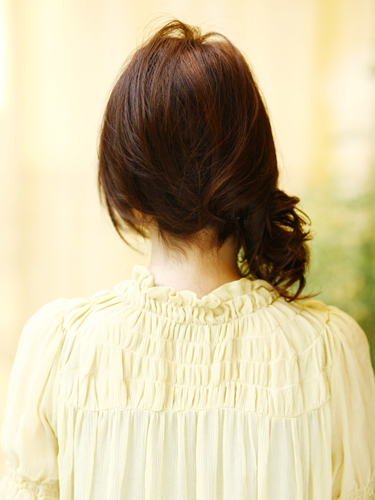 カーラーを使って髪全体にカールをしっかりつけておくのがポイント。ハチ上の表面の髪だけまとめ上げて、まず仮留めします。次に、下に残った髪を片サイドにまとめ、軽くねじりながらピンで留めます。仮留めしていた髪をほどいて下ろし、ねじった髪の根元付近にふんわり巻きつけるようにピンで固定して完成。