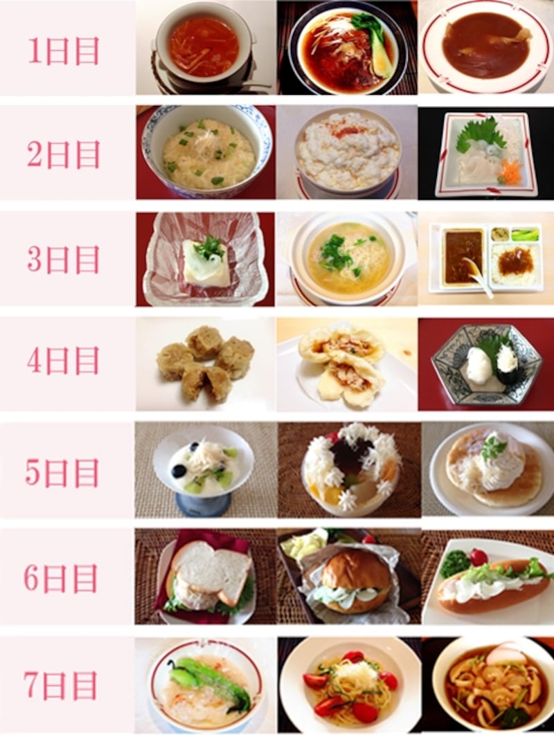 1日目:(朝)スープ (昼)ラーメン (夜)姿煮込み2日目:(朝)雑炊 (昼)淡雪仕立て (夜)お刺身