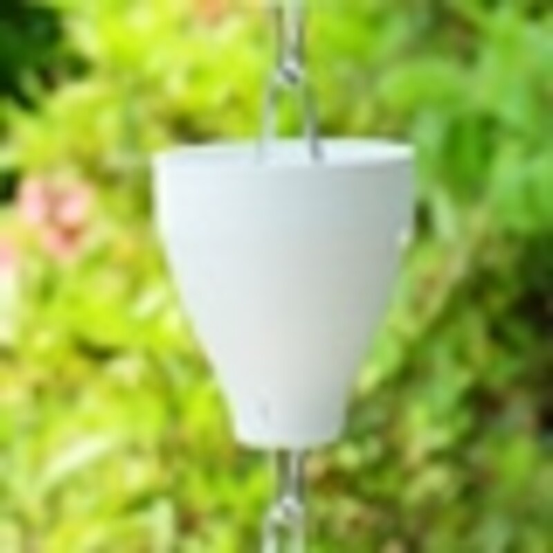 | 4. オリジナルデザインの鎖樋。白く塗装した直径5cmのガリバリウム鋼板製の本体をステンレスの金具で吊っている。 |