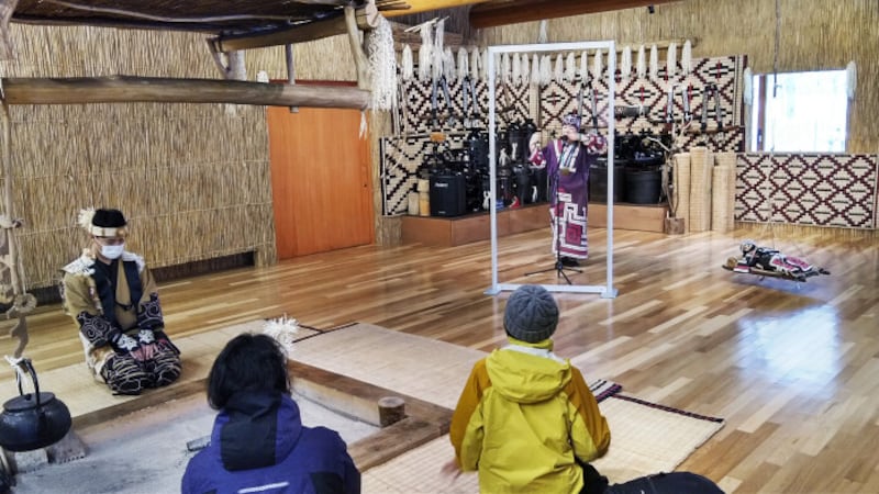 体験交流ホールでアイヌ伝統芸能を鑑賞