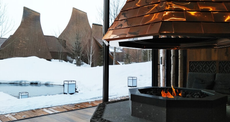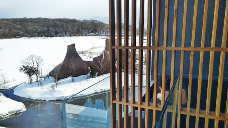 眼下に見下ろすとんがり湯小屋とポロト湖の絶景を独り占め、そして湖の向こうにはウポポイで見たチセの姿が。実に贅沢な一時を過ごすことができますが、あまりの心地よさで長湯し過ぎないようご注意を!